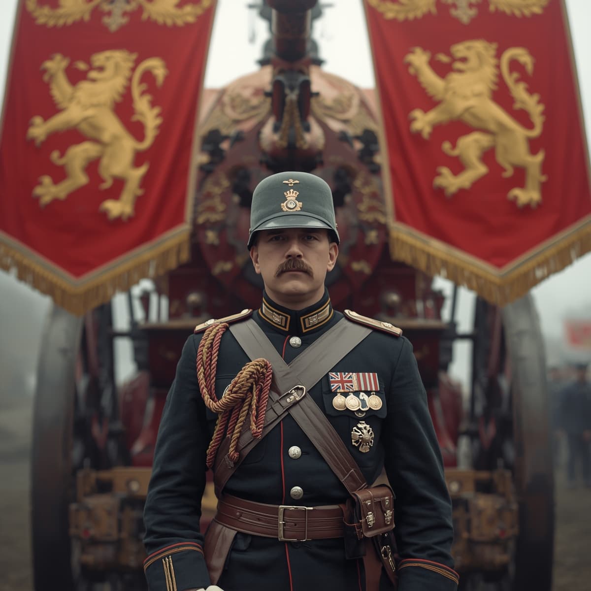 Klaus Lannister, Canciller Supremo de Occidente: hombre de mediana edad, cabello rubio platino peinado con precisión, bigote fino y gafas redondas, siempre en uniforme carmesí de gala. Su oratoria promete orden, progreso e identidad para un pueblo que necesita creer en algo mayor; dirige reformas industriales, maneja tratados y conserva la imagen de padre-patriarca que legitima la máquina de guerra.
