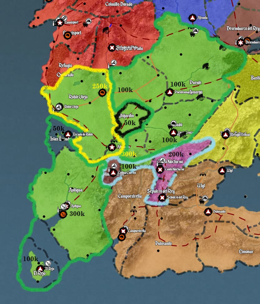 El único movimiento razonable que hay es aguantar en la línea Francis que vamos a montar en Altojardín. El Oeste avanzará liberando las provincias norteñas, detrás, la División Añil hará de Jinetes Represores del Apocalipsis. Lo sustancial es evitar que puedan reunir todas sus tropas en Vadoceniza, como parece que quiere hacer, pero me temo que lo conseguirá, el enemigo es mas rápido. A una mala, que el Oeste llegue a tiempo para apoyar al Rey Tormenta. De todos modos, en Vadoceniza fácilmente se pueden poner 300k del Dominio y 200k marqueños contra 250k del Oeste y otros tantos de la Tormenta. Un baño de sangre que lo mismo te explota en la cara.