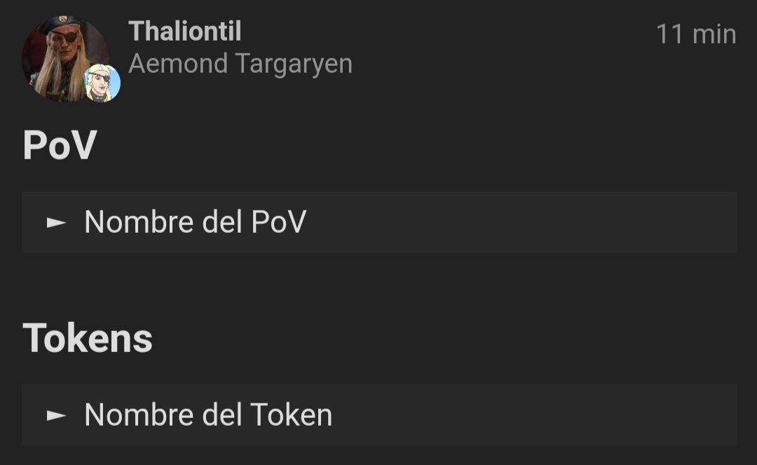 Confirmo que veo el foro, los PoV y Tokens y que empezaré a pensar en ellos. No sé si Criston Cole puede ser PoV mío…