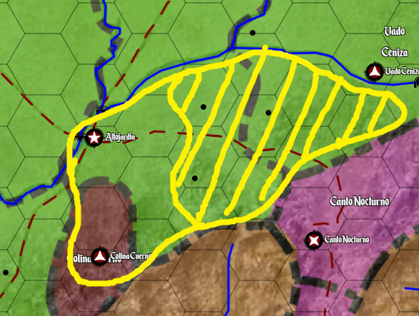 En amarillo el pool de reclutamiento potencial. La zona rayada es control “nominal”, pero bueno, me da que voy a tener que retirar a la División Añil, aprovecharemos para asentar el poder en esa zona.