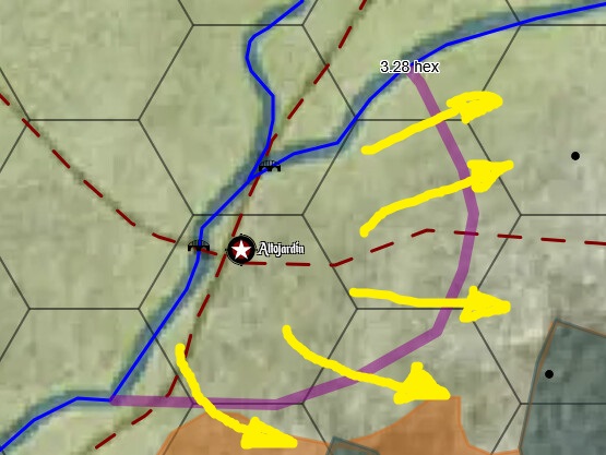 Repetimos modus operandi de la ofensiva anterior, pero avanzamos según la imagen. Bajo ningún concepto quiero que estas tropas federales puedan retirarse hacia Antigua, y si lo hacen, que sea una cantidad patética, algo así como 50k. Hay que forzarles a que retrocedan hacia el Este, hacia Vadoceniza y Colina Cuerno. Así además liberamos territorio ocupado.