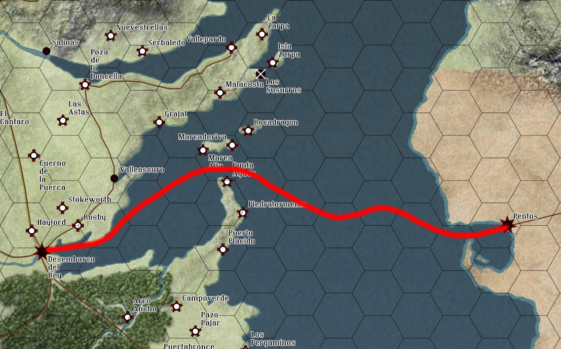 Lord Qarlton partirá hacia Pentos siguiendo la ruta marcada, mañana a última hora o el lunes estaría allí. Sin forzar, siguiendo rutas normales. En el barco suficientes riquezas (dos tokens) como para ser el primer pago (no me llevo TODO el tesoro, sino solo un aperitivo) a compañías mercenarias. Lo que junto con el buen hacer de Lord Qarlton y la promesa de más pago por parte del Trono de Hierro debiera ser suficiente para reclutar flotas mercenarias en Pentos.