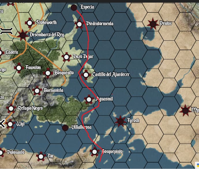 MOVIMIENTO 1: mis flotas que estaban en el puerto de Desembarco y al lado de Valleoscuro se reúnen con la flota que está al lado de Bastión. En cada una de las flotas al lado de Desembarco embarca un ejército:
