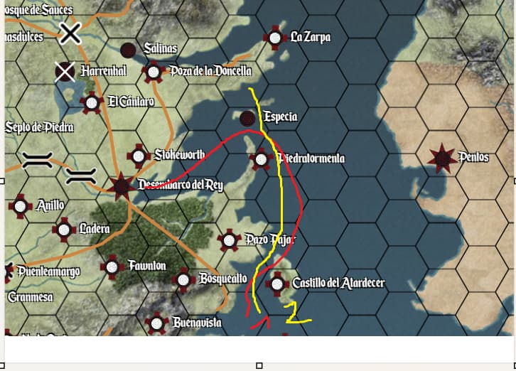 Ir hacia Lanza del Sol y hacernos con la flota Martell, si tienen, y, posiblemente, intentar la captura del Príncipe Doran. Pero aquí lo que vamos a hacer es ir a encontrarnos con el enemigo para capturar sus naves (en algún barco habrá llegado Aegon) con mi mejor marino y superioridad naval.