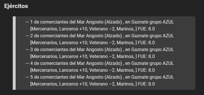 - Flota de Marcaderiva 6 (Alzado/Galeras) , en A Marcaderiva grupo VERDE [Séquito, Hda +2, Lanceros +8, Veterano +2, Marinos] FUE: 24.0
