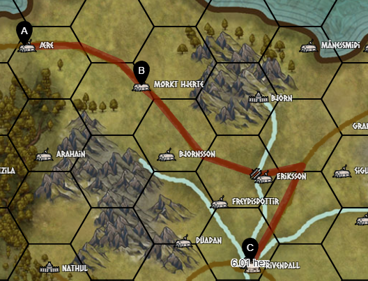 El primer trayecto se realizara desde Aere a Rivendall donde marcharemos con dos ejércitos a los que se unirán otros dos al paso por Morkt Hjerte.