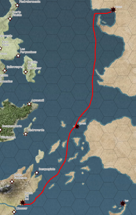 Ruta: De Pentos a Lanza del Sol, por Tyrosh, me salen 16 hexágonos de costa (raro es el hexágono que no haya, al menos, una isla). Por lo que serían 32 horas. Llegando mañana por la tarde.